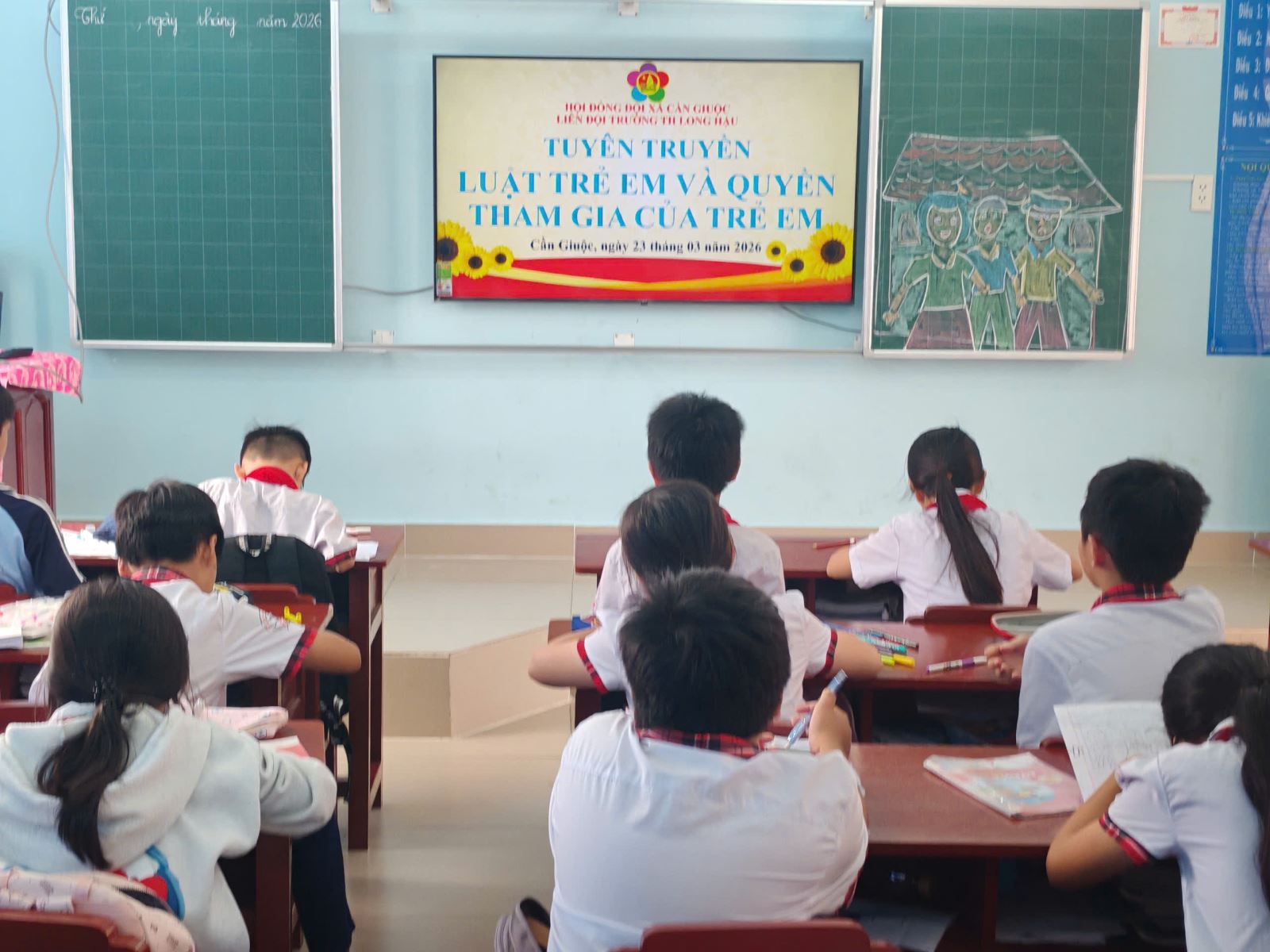 LIÊN ĐỘI TRƯỜNG TH LONG HẬU TUYÊN TRUYỀN LUẬT TRẺ EM Thực hiện chương trình thi đua năm học 2025 - 2026, ngày 23/03/2026 Liên đội Trường TH Long Hậu tuyên truyền Luật trẻ em và quyền tham gia của trẻ em. Thông qua buổi tuyên truyền các em học sinh biết Luật trẻ em gồm 7 chương với 106 điều, trong đó có 25 điều quy định về quyền của trẻ em và 5 điều quy định về bổn phận của trẻ em.